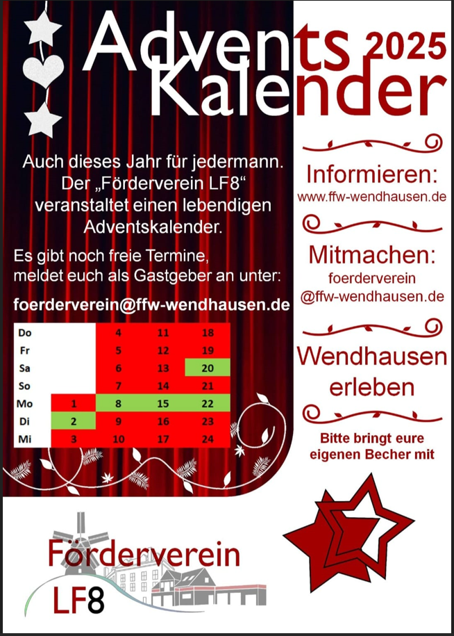 Bis zur Adventszeit sind es nur noch ein paar Wochen. Wer am Lebendigen Adventskalender als Gastgeber mitwirken möchte, sollte sich bald melden. Es gibt noch wenige freie Termine (grün gekennzeichnet). Bitte meldet euch zeitnah unter der angegebenen E-Mail-Adresse an.